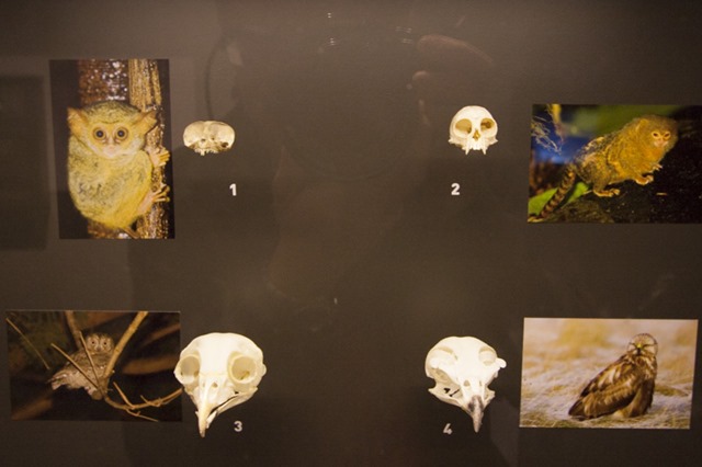 Ainsi côté vue, “bigger is better”, chez le tarsier chaque œil a le volume du cerveau (le n°1 sur la photo ci-dessous), tandis chez les rapaces l’œil s’allonge pour optimiser le volume. On apprend pourquoi il faudrait un anti-yeux-jaune (et non rouge) pour prendre en photos nos chats : le tapetum lucidum qui tapisse le fond de l’œil permet d’augmenter la quantité de lumières perçues en réfléchissant les rayons incidents mais induit une teinte jaune caractéristique.
