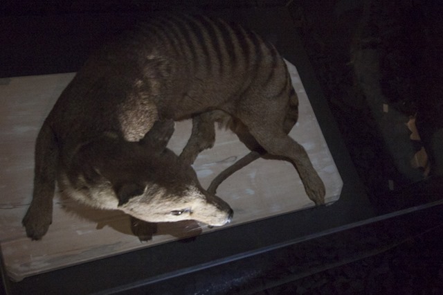 Le loup de Tasmanie, un des rares exemplaires empaillés encore conservés (espèce éteinte depuis 1936, ne pas confondre avec le diable qui est aussi menacé d'ailleurs).