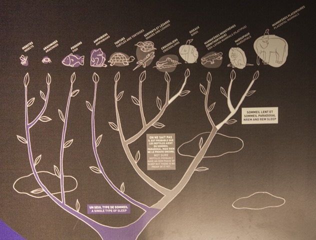 La dernière partie de l’exposition traite de ceux qui ne s’agitent pas en tous sens, sitôt le soleil couché, et traite du sommeil et du rêve. Le sommeil se pratique différemment suivant les genres :ainsi chez les cétacés le demi-sommeil est à prendre au pied de la lettre puisqu’on dort un demi-cerveau à la fois, l’autre gérant les remontées à l’air libre pour respirer. Champion du sommeil rapide, l’okapi dort 5 minutes par jour…. en tranche de 30 secondes, à l’autre bout du spectre, les feignasses de félins sont plutôt vers 20 heures par jour.