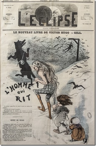 Le roman de Victor Hugo, L’homme qui rit est l’objet d’une exposition place des Vosges. Autant le dire tout de suite, mieux vaut avoir lu le bouquin, ou à défaut le résumé proposé à l’entrée de l’exposition, car sinon on se demande vraiment ce qui se passe.