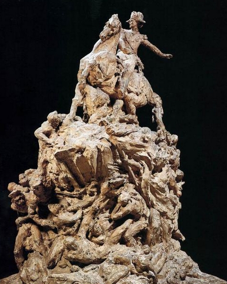 L’intérêt de l’exposition est de donner à voir les travaux préparatoires de ces grandes oeuvres, mais aussi les projets qui ne seront pas réalisés comme ce tourmenté projet de monument au Maréchal Moncey – l’officier à cheval sur le tableau “La barrière de Clichy” de Vernet – où le sujet équestre prend place sur un trône de corps torturés.