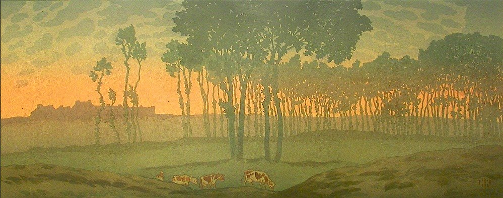 Rivière bien qu'affligé d'une tare difficile à porter (il est parisien) se caractérise par son excellence dans le paysage. Et son amour de la Bretagne. Influencé par des estampes qu'il a reçus ed'un riche amateur japonais en guise de paiement d'une commande décorative pour sa demeure, il se constitue petit à petite une collection d'images (bien plus classes que des Panini même s'il n'y a pas de brillantes) et transpose leur esthétique dans ses propres réalisations.