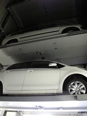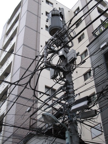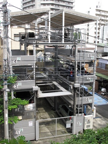 Autres exemples, communs à toutes les villes nippones vues jusqu'à présent : les transfos sur pylônes et les parkings auto superposés.