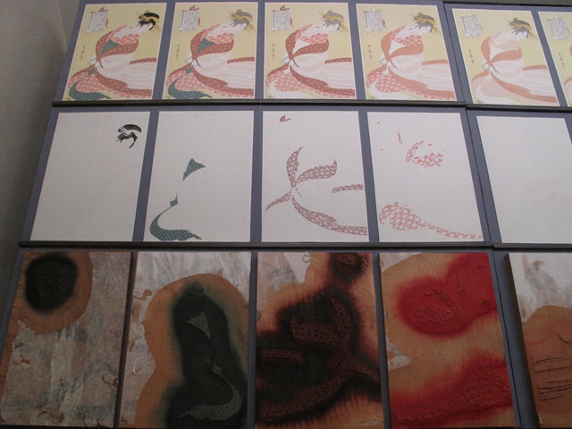 Un exemple d'estampe. En bas de chaque photo, le bloc encreur en bois, au milieu le résultat de ce bloc seul, et en haut le résultat avec les blocs précédents.