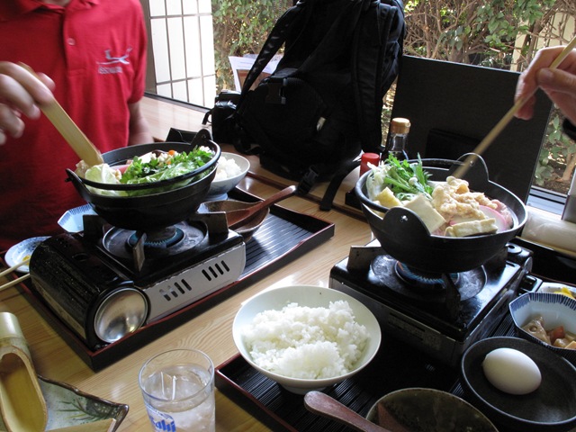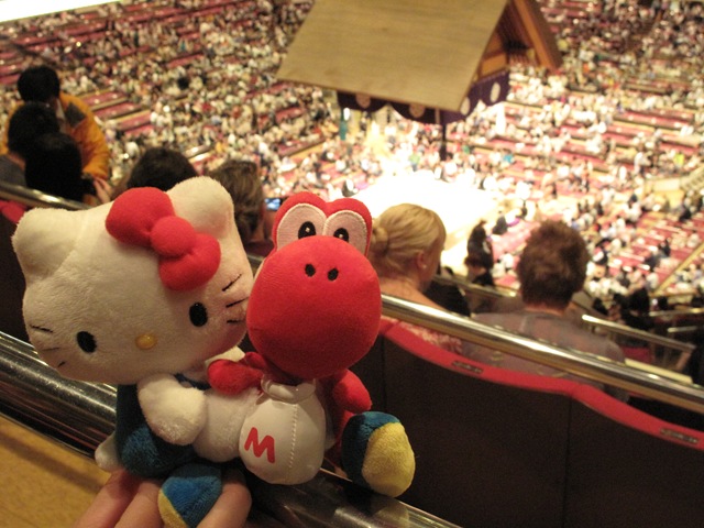 Le musée terminé et sous un soleil toujours présent, nous entrons dans le stade. Avant de prendre nos places, nous nous restaurons : certains prennent le Chanko qui serait le plat typique des sumos (mais j'ai un doute, j'en avais une autre version plus roborative il me semble), une sorte de ragout de plein de trucs (légumes et viandes) accompagnés de riz et d'un oeuf cru.