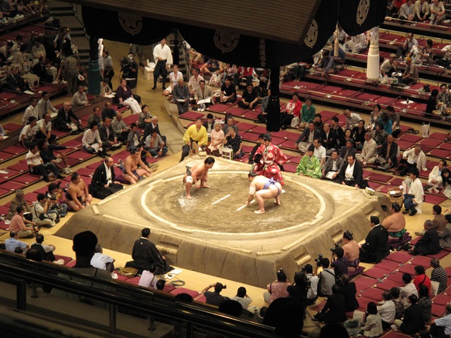 A chaque combat les 2 combattants montent sur le dohyo (le ring) couvert de sable et délimité par des sacs de riz. Ils se saluent et s'engagent dans un combat de regards, ponctué d'assouplissements et de retour au coin pour aller chercher du sel. Ce dernier est jeté sur le dohyo, histoire de faire fuir les démons qui ne seraient pas encore morts d'ennui (non je rigole).