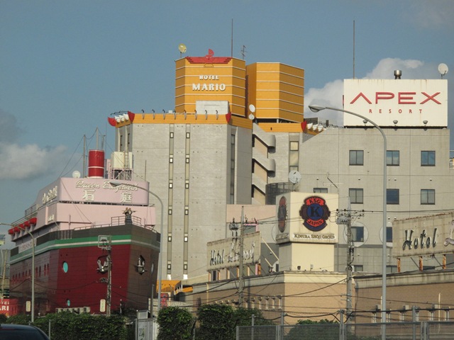 Sur la route du retour, le love hotel "mario" devant un paquebot kitsch.