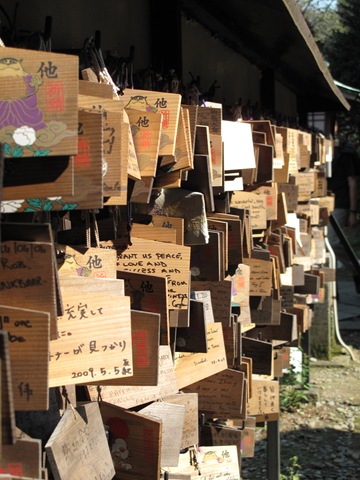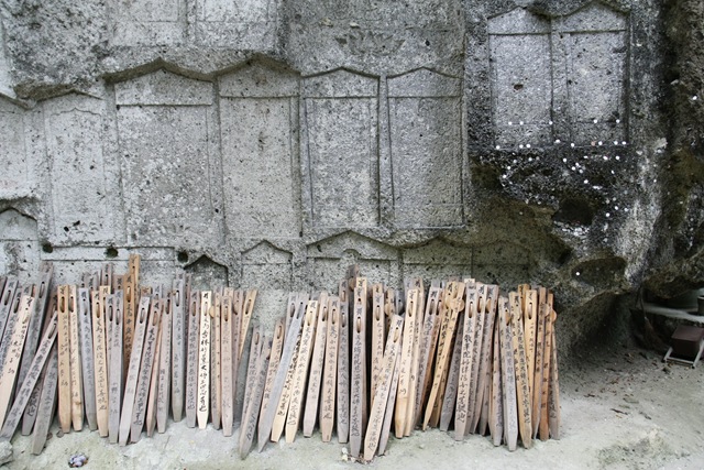 des tablettes en bois, chacune contenant une prière. Elles sont disposées devant les temples.