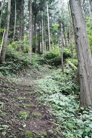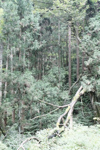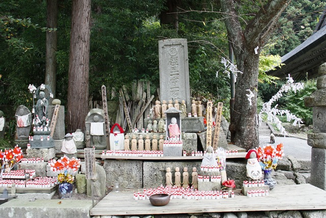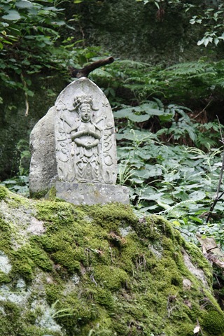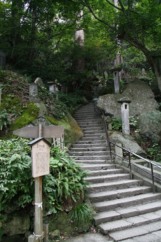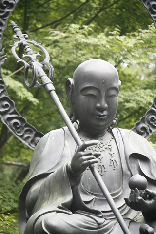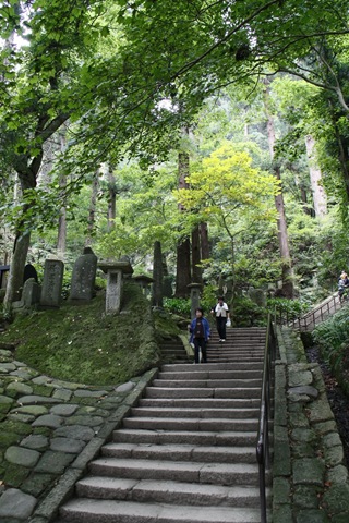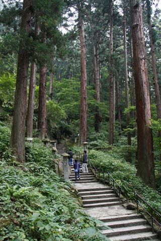Nous entamons ensuite la montée des 1025 marches qui mènent au sanctuaire le plus haut. La montée s'effectue parmi une magnifique forêt de cèdres aux troncs rouges, entourés de mousses et statues de divinités du panthéon boudhiste (a priori Amida, d'après ce que disait un guide).