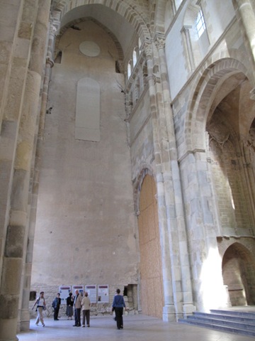 Arrivée à Cluny : "mais où qu'elle est l'abbaye ?" (2ème désillusion). Non, je sais ce que vous pensez, j'ai regardé, elle y était pas. En fait, Cluny qui était à l'époque la plus grande abbaye de toute la chrétienté (sa taille ne fut jamais égalée par les cathédrales gothiques plus anciennes) a été amputée de...en fait quasi tout sauf le bras sud d'un des 2 transepts... Donc ça laisse pas grand chose à part l'imagination pour essayer d'appréhender la taille de l'édifice :