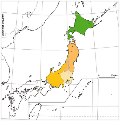 Depuis Tokyo, nous allons nous rendre à Hokkaido (la grande île septentrionale) pour un peu plus de 2 semaines de rando/volcan/nature avant de revenir à la capitale. Nous ferons les grands trajets en train puis nous prendrons le risque de louer une voiture (non pas une impreza ! ce sera une prius) pour circuler dans Hokkaido (en vert sur la carte, Tokyo étant dans la zone saumon clair).