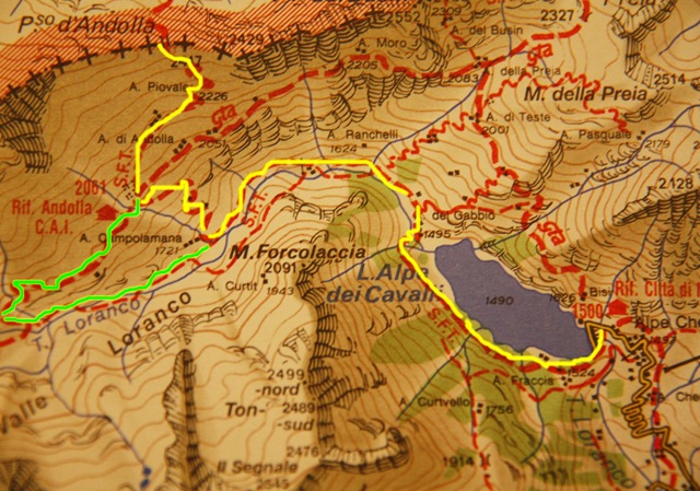 Arrivée au refuge d'Andollaj, nous constatons bien vite les divergences entre leurs cartes et la notre qui nous indique moults chemins qui n'existent que dans l'imagination torturée de cartographes sous amphétamines (en vert donc sur la carte précédente).