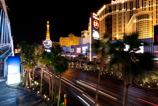 Las Vegas choque toujours autant, ville sans véritable âme et qui en compte pourtant 2 millions (sur les 2,7 millions du Nevada), surgissant en plein désert, et dont les tours mi-béton, mi carton-pâte s'élancent vers les cieux accompagnées du projecteur trônant à l'apex de la pyramide du Luxor (qui possède un certainement un bar mais je ne suis pas allé voir si quelqu'un jouait avec la sono). Par rapport à mon dernier passage, assez ancien il est vrai, j'ai l'impression qu'il y a plus de SDF et de rabatteurs pour les dizaines de boîtes de la métropole : ces derniers prennent position stratégiquement aux passerelles qui permettent aux piétons de traverser les 8 voies du strip sans rejoindre leur créateur (qui doit déjà leur reprocher d'avoir égarés leurs pas dans cette ville).