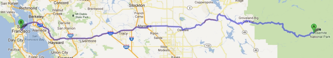 Nous quittons Yosemite, plus précisément Oakhurst, après 4 nuits passées pour un bout de route en direction du Pacifique et San Francisco.