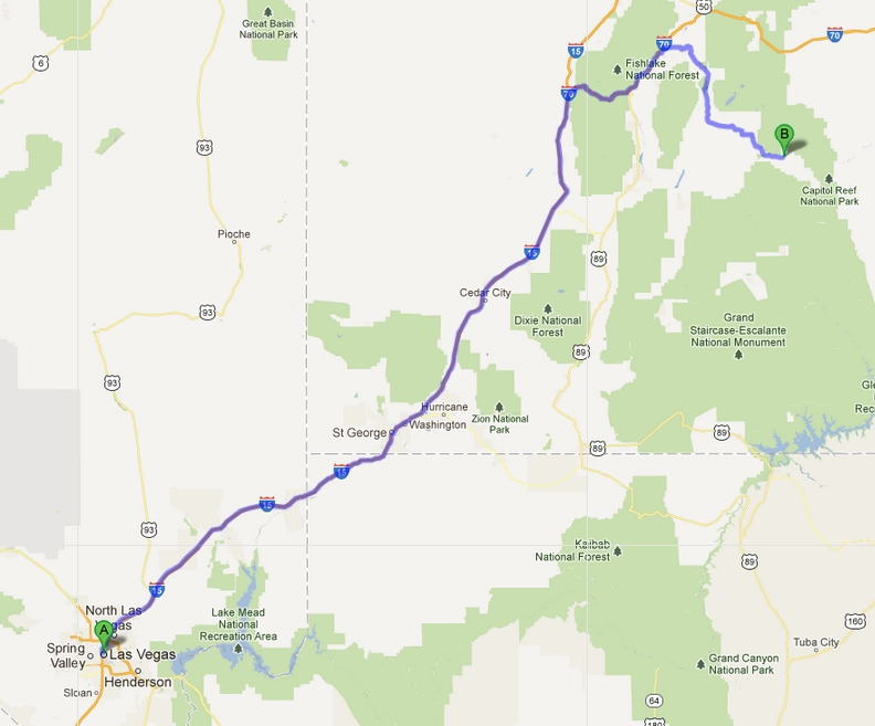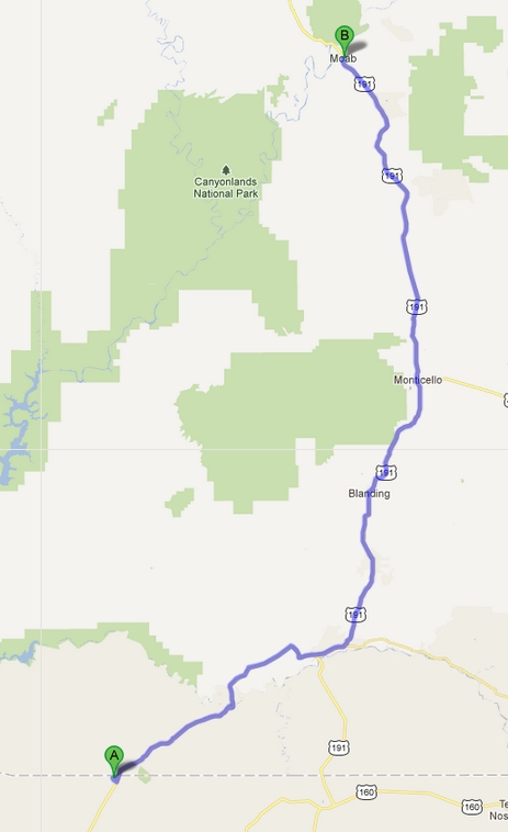 Aujourd'hui, nouvelle journée de transition, entre Moab et Kayenta, sise juste au sud de Monument Valley. La route était en réalité moins directe que sur la carte ci-dessous car nous avons fait un crochet par le Natural Bridges National Monument.