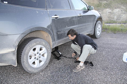 bon alors crevaison (mais pas du pneu prévu), dans un coin paumé. Rustinage grâce à un américain de passage. Cela tiendra mais pas assez longtemps nous stoppons dans un autre coin paumé et là suprise impossible de détacher la roue de secours... le tout sans réseau GSM. On est rentré en stop en abandonnant la voiture. Notre mission est maintenant de la récupérer puis de l'échanger pour poursuivre le voyage.