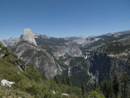 Le Half Dome avec Vernal et Nevada Falls vus depuis Panorama Trail