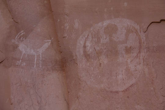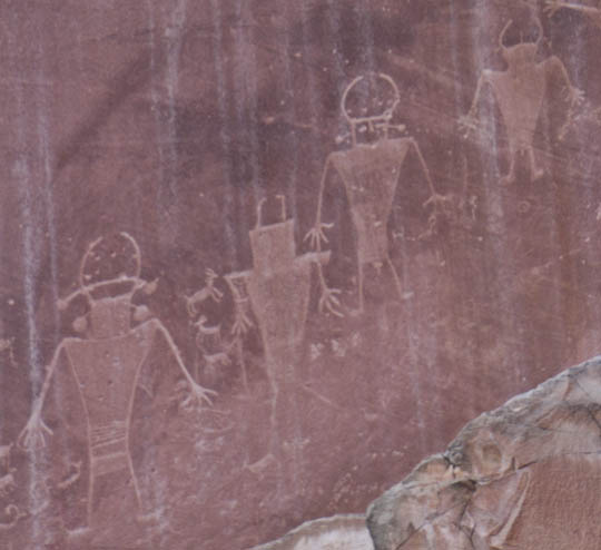 S'il n'est pas si fréquenté que ça, c'est parce qu'il est un peu loin de tout, mais aussi qu'il ne présente pas forcément autant d'attraits que ces cousins. Attention, ne me faites pas dire ce que je n'ai pas dit, c'est beau et grandiose et ce qu'on veut, mais ce n'est pas aussi marquant que les cheminés de Bryce ou la majesté du Grand Canyon. Finalement, c'est peut être une note en vert et bleu qu'il faut garder en mémoire, avec le petit paradis créé par le passage de la Fremont River à travers roches rouges. Petit coin de verdure et de fraîcheur, perdu dans des contrées quand même bien arides, et qui a été fort tôt colonisé, comme en témoignent les pétroglyphes indiennes (ci-dessous) : les mormons sont venus (un peu) après. Le Mount Helen, tout proche à vol de de corbeau, ne fait pas partie du parc mais on l'en excuse, tant la vue est belle et les bouleaux abondants (j'adore les bouleaux).