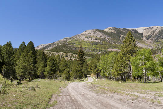 Montée au col dont j'ai oublié le nom (probablement Bull Creek pass) sur une piste assez dure à travers les bouleaux (j'adore les bouleaux), en croisant parfois des campgrounds superbement aménagés. Nous faisons une petite randonnée au sommet, elle est rendue un peu difficile par l'altitude relativement élevée (3500 m).