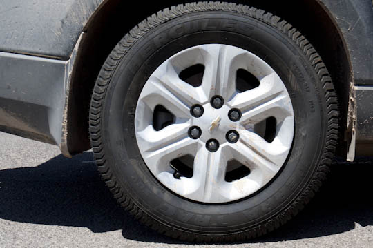 Alors là pour le coup, il nous aura bien embêté ce pneu, sur la photo là on voit le glorieux successeur, tout neuf (contrairement aux autres, usés et crevassés); au passage aux USA on ne s'ennuie pas avec la symétrie, tu as un pneu nase, on te change que celui-là et pas le train.