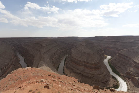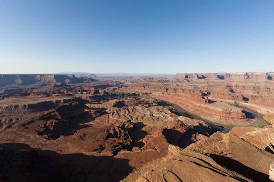 Commençons par ce dernier : avant tout il faut savoir (ou alors ne pas rouler comme des malades devant les panneaux explicatifs, mais cela c'est au-dessus de nos forces), que les parcs d'états ne prennent pas la carte nationale (America The Beautiful) donc c'est 10 $ pour chaque journée. Dead Horse est un petit parc qui est, en très gros, un point de vue sur le canyon creusé par le Colorado. Un point de vue, mais quel point de vue. Plein Sud, vous apercevez à gauche les montagnes de La Sal, puis les bassins de potasse, puis les méandres du Colorado avec une belle végétation qui détonne dans l'environnement aride local. La région produit de la potasse mais est aussi pourvoyeuse d'uranium : son exploitation a laissé des marques - notamment des pistes de bulldozers et camions - dont le désert commence à récupérer. La scène finale de "Thelma et Louise" a été tournée ici (pour figurer le Grand Canyon) mais je vous raconte pas pour pas spoiler.