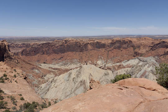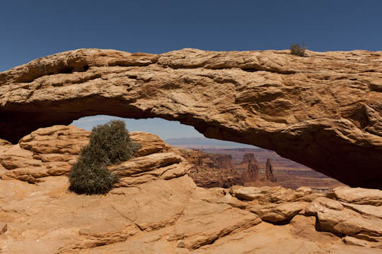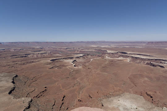 Canyonlands est constitué de 2 parties : au nord, Island in the skies et au sud Needles. Bon alors, Island est bien mais pas top non plus. Une partie du parc permet de prolonger un peu les paysages du Dead Horse : il y a une jolie ballade sur le rim à faire au à Grand View Point Overlook (elle n'apparaît pas sur la carte du parc). Sinon vous trouverez un cratère (pas très beau je le crains) dont on hésite encore à affirmer l'origine (météorite ou remontée saline), un petite arche donnant sur le vide (Mesa Arch).