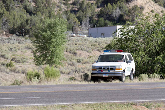 Nous repartons 30 minutes plus tard, essayant de ralier Boulder avec 5 miles de piste restant et 25 miles de route. Nous passons la ville et montons plein nord pour Torrey, certains que le plus dur est derrière nous. La montagne est verdoyante couverte de bosquets de bouleaux qui prennent de merveilleuses teintes orangées avec le soir (notez bien cette discrète indication temporelle savamment introduite). Les daims gazouillent (si si) et gambadent (aussi) dans les prés. Entourés de tant de beauté nous faisons un petit arrêt photo qui dégénère vite, le patch de notre pneu ayant lâché.
