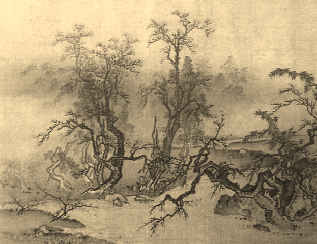 Si la découverte est progessive horizontalement, elle l’est aussi dans la profondeur. On ressent ainsi parfois une accoutumance visuelle à l’oeuvre qui nous fait distinguer des objets que nos regards initiaux avaient oublié. Ainsi sur le détail suivant, combien un regard furtif ne voient que de tortueux arbres auxpremier plan, penchés sur le cours d’eau et ignorent la lente émergence des cimes des bambous et conifères du second plan ?