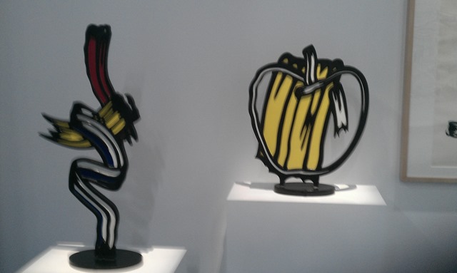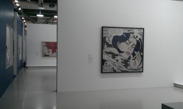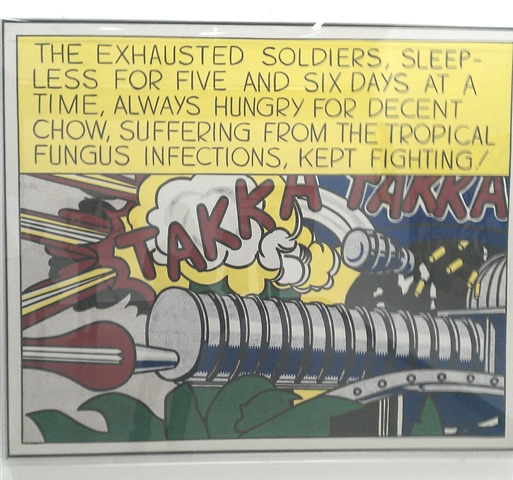Il faut une petite acclimatation graphique au monsieur car dès les 2 premières salles, le ton est donné, on va pas faire dans la nuance, les doux dégradés et les polychromie discrète. Ici on aime le brut, le primaire. On commence d’ailleurs assez violemment par des œuvres inspirées des Comics belliqueux de l’après-guerre et d’autres peintures aux couleurs assez dures (comme un pneu aaaaaaahhh un pneu, il va tous nous tueeeeerrr). Fort heureusement cela s’assagit un peu après (ou alors c’est qu’on comme à s’habituer), en revanche des petits points vous en aurez tout le temps.