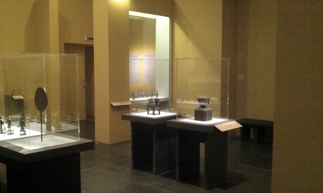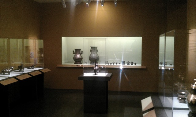 En circulant à travers les vases _jue _ou _gui_, les bassins _pan_, on découvre donc le goût pour l’antique en vigueur à l’époque qui va chercher à travers des patines à vieillir les pièces, voire à ajouter des défauts (comme les lignes de collage des morceaux) pour faire plus vrai.