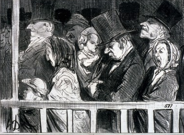 Disons le de suite, chaque œuvre nécessite une lecture, une attention auxquelles nous ne sommes plus vraiment habituées, l’humour est toujours présent, en situation ou par des jeux de mots mais l’éloignement temporel n’aide pas à la compréhension. Heureusement, les explications sont là et nous aident (par exemple si vous ne savez pas que ceux qui faisaient la claque au théâtre étaient surnommés les romains…). L’artiste croque le spectacle en scène mais surtout le off, l’envers du décor avec ces acteurs obligés de mimer bombance sur scène et mourant de faim à côté, ces orchestres somnolant et des parisiens déjà prêts à de longues queues pour voir les pièces :