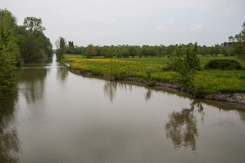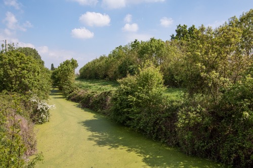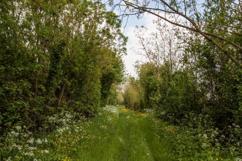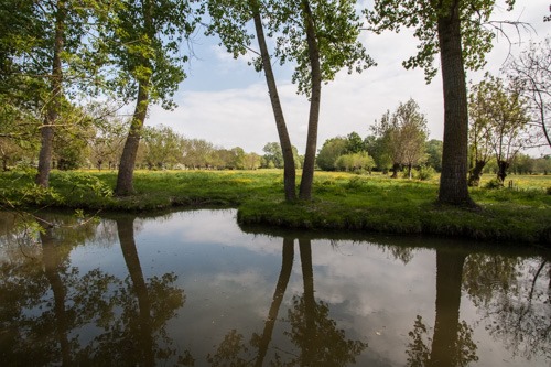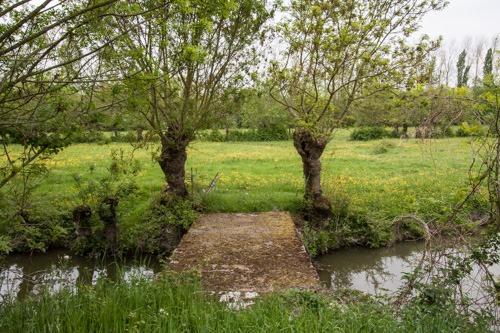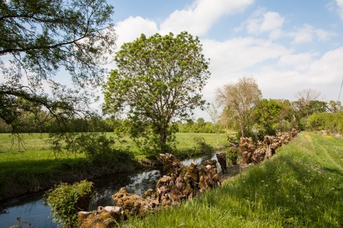 Disons-le tout de suite, il ne sera pas beaucoup possible de voir la dite abbaye, cachée qu’elle est par la végétation. Et c’est bien un peu le problème (c’est vrai quoi il est mal tenu ce marais avec des arbres partout), car on chemin sur des grandes lignes droites entre deux haies, le plus souvent de frênes têtards, sans bien voir ce qui nous entoure. On voit aussi un pont-aqueduc, mais alors c’est pas évident du tout, car j’avais lu un peu trop vite le descriptif, et je suis passé sans me douter de la chose, bref… mea culpa.