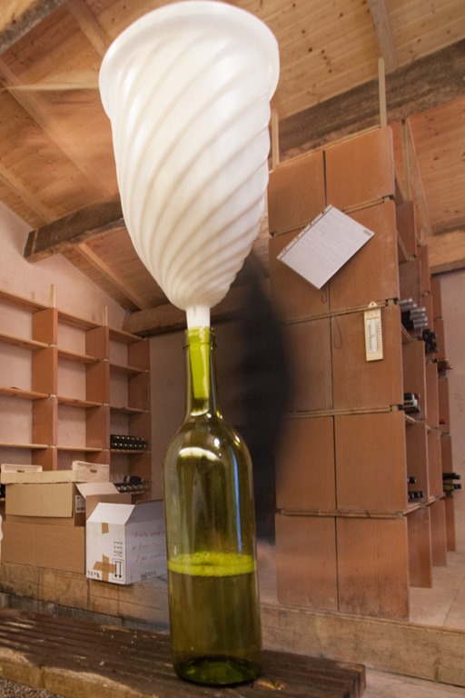 Ici nous sommes à l’étape de filtrage pour la production du blanc qui part en méthode champenoise. L’entonnoir contient une sorte de filtre à café, très épais… et qui s’encrasse très vite. Après 3 litres filtrés, ça coule au goutte à goutte…Bref c’est un peu comme au boulot, on attend que ça se passe !