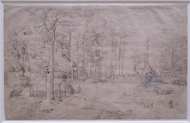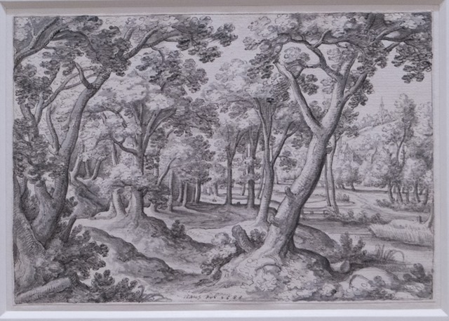 34 : Hans Bol, 1534-1593, Paysage de forêt traversé par une rivière, 1588. Pierre noire (tracers), plume et encre brune, lavis gris.