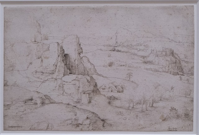 25 : Anonyme (Anvers), Paysage panoramique avec des rochers escarpés, vers 1525-50. Pierre noire (traces), plume et deux nuances d'encre brune ; collé en plein