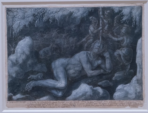59: Johannes Stradanus, Quatre dessins d'une série de l'Odyssée, Ulysse et Polyphène, vers 1600-05, Plume et encre brune, lavis bleu, rehaussé de blanc.