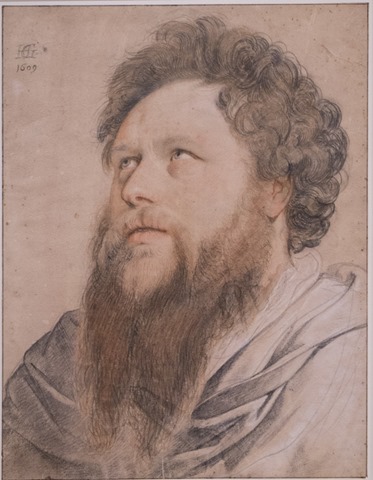 82 : Hendrick Goltzius, Portrait d'homme barbu, 1609, craies noires, rose, rouge, brune et blanche, lavis brun.