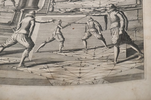 Académie de l'espée de Girard Thibault d'Anvers: remarquez l'architecture idéale et les formes géométriques au sol, censées modéliser les possibilités de déplacements, attaques, esquives de chaque participant.