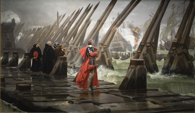Richelieu, c’est aussi le siège de la Rochelle, illustré ici notamment par la superbe peinture d’Henri-Paul Motte qui en livre une vision déjà cinématographique sur le modèle de son maître Gérôme.