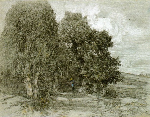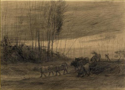 Boudin, lui illustre par les scènes de marché breton, et une inquiétant _personnage sur un chemin s’enfonçant dans un bois_.