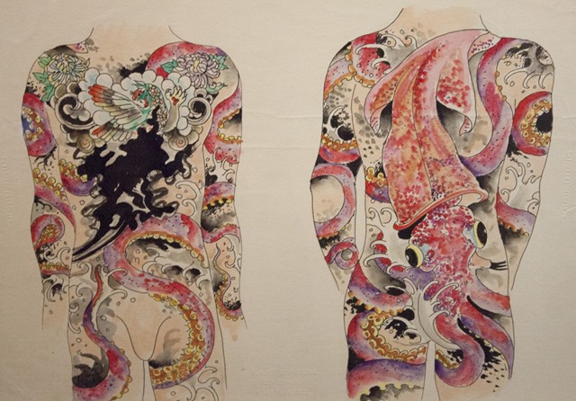 Le Japon occuper une place importante dans l’histoire du tatouage. Dès 720, le Nihon Shoki, mentionne de telles marques, comme infamantes. De pénal, il deviendra ensuite plébéien, puis preuve de bravoure –notamment chez les pompiers, métier héroïque quand les villes nippones sont toutes de bois construites. La pègre en prendra ensuite possession, emblématique sur les peaux des yakuzas qui reprennent ainsi les marques de reconnaissance des protagonistes d’_Au bord de l’eau_. Il basculera dès lors dans le tabou. Ne manquez pas cette photo de yakuzas au bain public, avec des lunettes noires comme seuls vêtements.