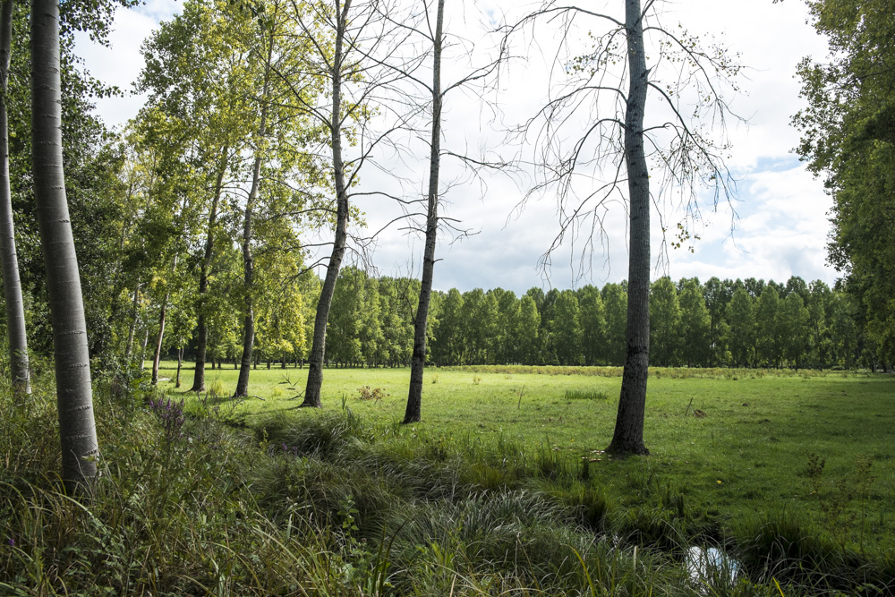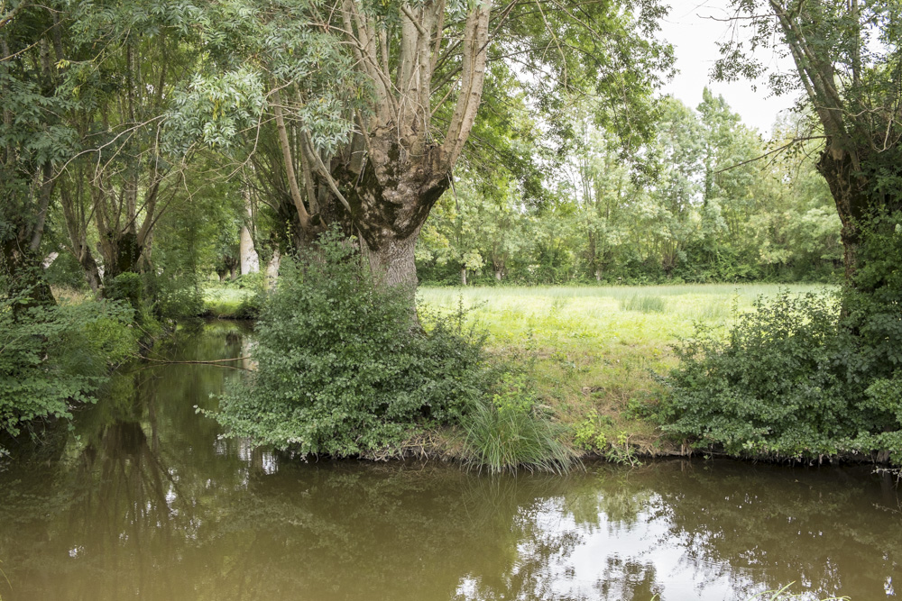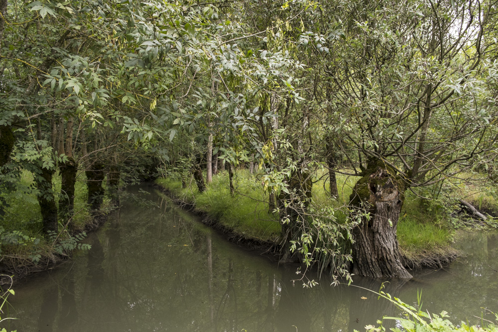 Toujours les paysages typiques des marais, avec des prairies encadrées de peupliers et beaucoup de frênes et saules têtards.