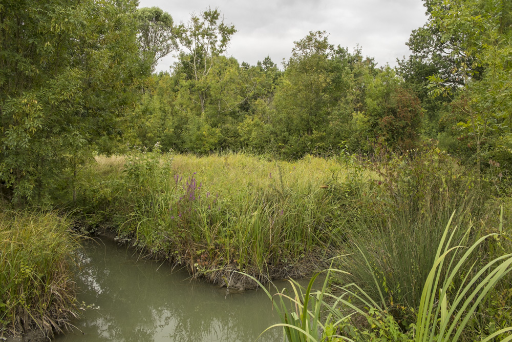Dans la réserve, c’est très joliment aménagé et cela illustre en grandeur-nature des différents biotopes que vous pouvez voir dans la région. En prime, des ruines des “huttes”, soit l’habitat traditionnel du marais (peuplés de huttiers donc). Des panneaux pédagogiques vous apprendront ce qu’est une terrée, les espères qui y vivent et la raison d’être des arbres têtards (qui ne sont pas naturellement comme ça mais qui sont taillés régulièrement à hauteur d’homme pour le bois), ce qu’est une motte soit un terrain jamais inondé et cultivable. Deux observatoires, l’un plutôt pour les mammifères et l’autre pour les oiseaux sont aussi aménagés. Pas de chance, à part une cigogne nous n’avons pas croisé grand monde, mais en plein mois d’août ce n’est guère étonnant.