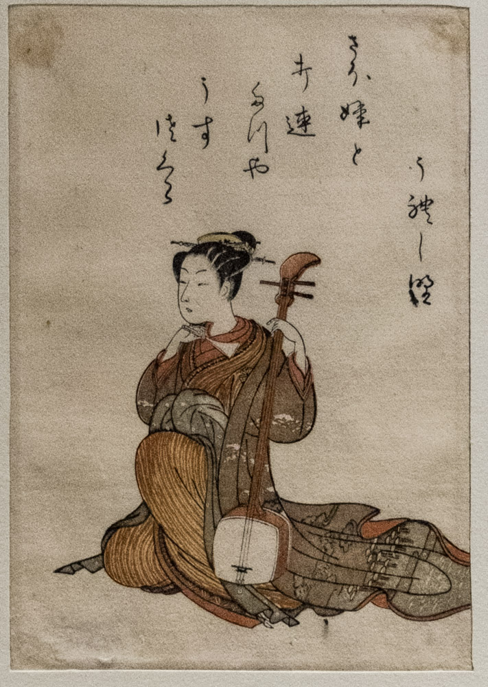 Car avant lui, les estampes étaient rouges (plutôt orangées Suzuki Harunobu, ou rouge-verte. Avec son travail, des nuances mauves, jaunes, brunes, apparaissent qui permettent de détailler les tenues des jeunes dames exerçant un métier que la morale réprouve. Actrice bien sûr, à quoi pensiez-vous ?