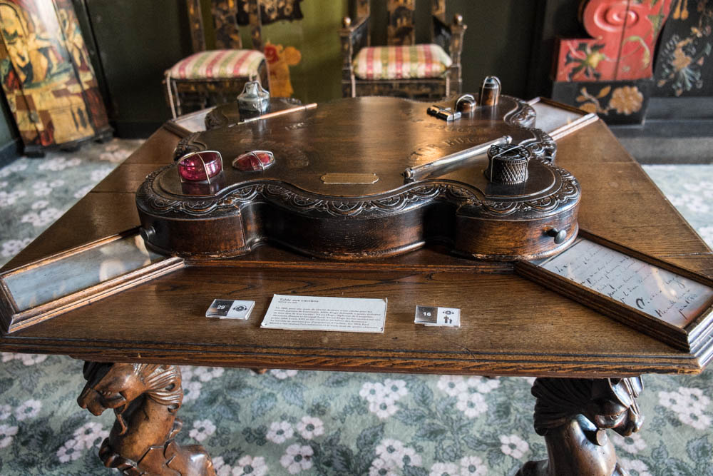Sinon vous pourrez aussi admirer, la table de travail de Victor Hugo, originale en ce sens qu'elle lui permettrait d'écrire debout, son lit de mort, son kitschissime cabinet chinois et une table collector destinée à une oeuvre de bienfaisance avec les encriers de (Lamartine, Dumas, Sand et Hugo), excusez du peu.