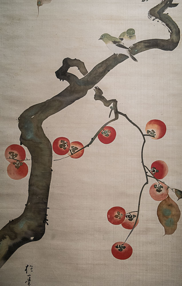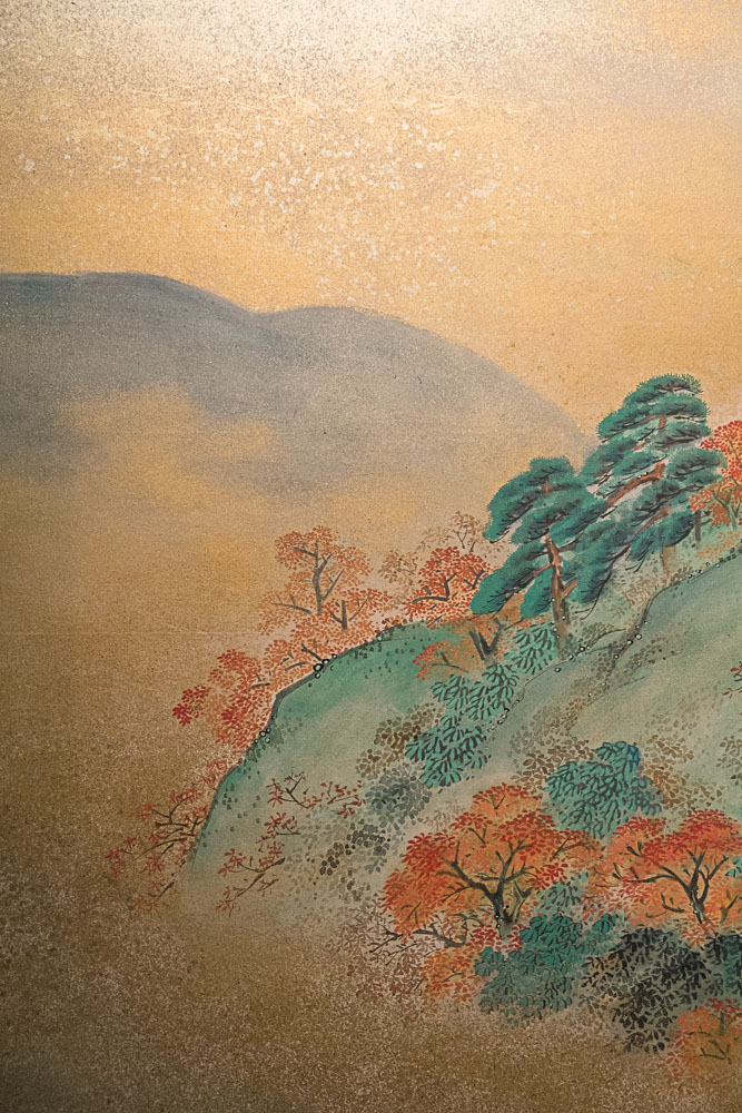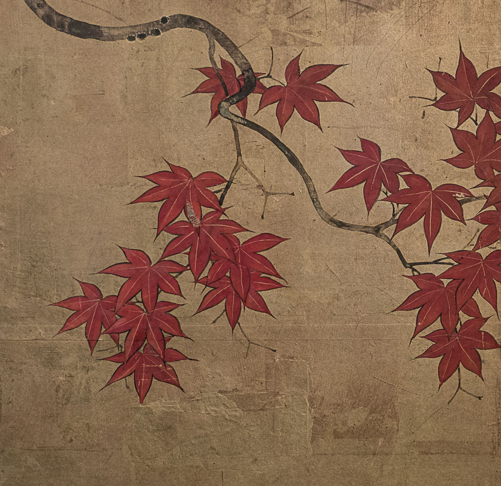 Le courant Rinpa, plus décoratif, convoque lavis d'or, couleurs riches et profondes pour des kakis et des feuilles d'érables en automne.