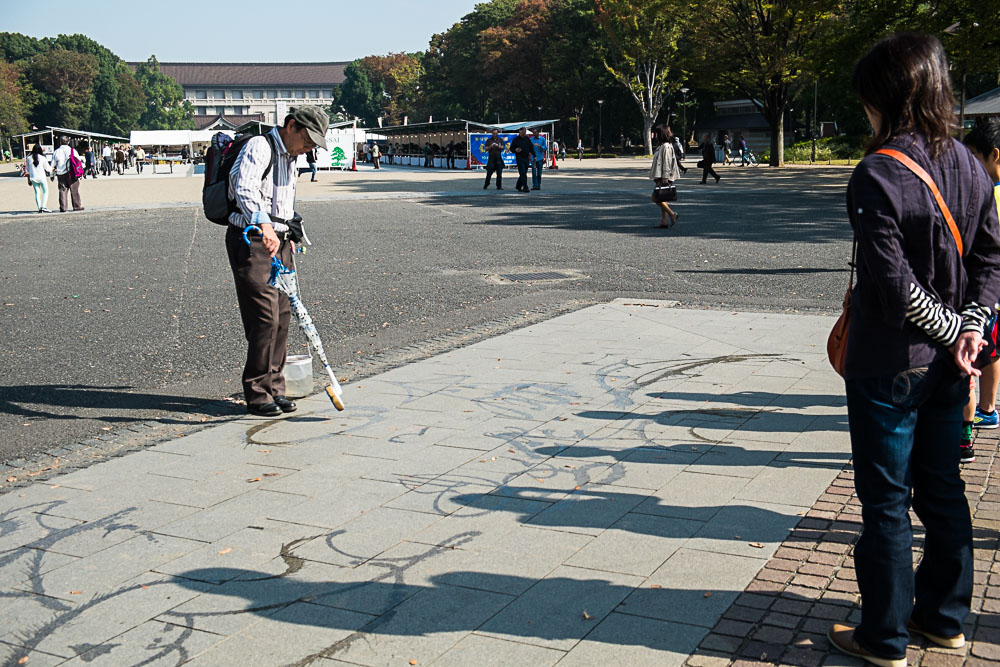 Un calligraphe en technique mixte parapluie/eau sur bitume devant l'entrée du zoo.