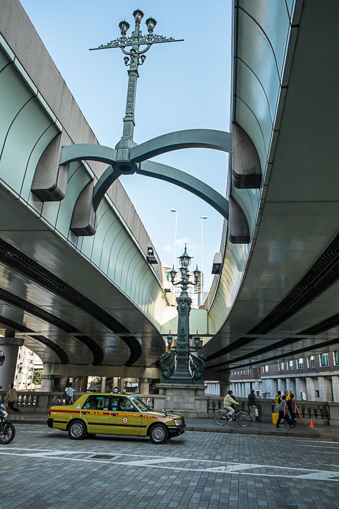 On déjeune un peu plus tard sur le pouce, en pleine rue, pas bien certains d'avoir le droit de faire ça, mais bon. Nous passons par Nihonbashi, le pont monument historique surplombé par une autoroute 2 fois 4 voies...