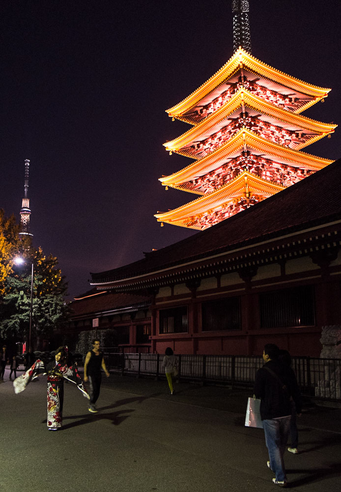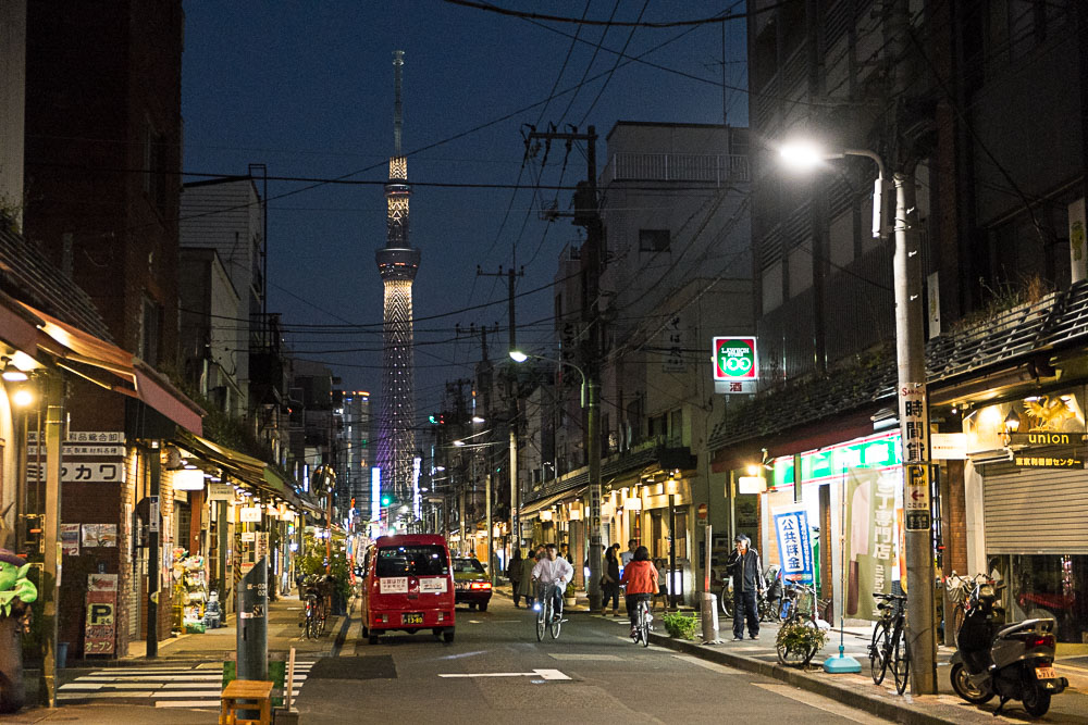 On termine notre grand tour de cette partie est de la capitale par Asakusa (de nuit) : le temple est déjà fermé mais cela ne décourage pas les fidèles qui font la queue pour prier en versant l'obole de rigueur. Les japonais ne semblent pas très croyants ou pratiquants, plutôt superstitieux ou voulant respecter les traditions. Pour nous y rendre, nous passons par Kappabashi-Dori : longue avenue spécialisée dans les ustensiles de cuisine, couteaux, bols, couverts, etc...La nouvelle tour Skytree se profile à l'horizon.