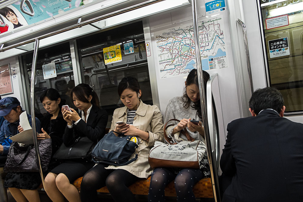 Que font les japonais dans le métro ? Ils dorment, mais quand ils ne dorment pas ils sont sur le portable. A vrai dire, ils sont tout le temps sur leur portable, quand ils marchent, quand ils mangent et, je le soupçonne, même dans des endroits plus intimes. Vous me direz que ce n'est pas nouveau, et c'est vrai, les terminaux ont un peu changé, fini les téléphones à clapets avec plein de décorations kawaii, voici les smartphones avec plein de décorations kawaii.